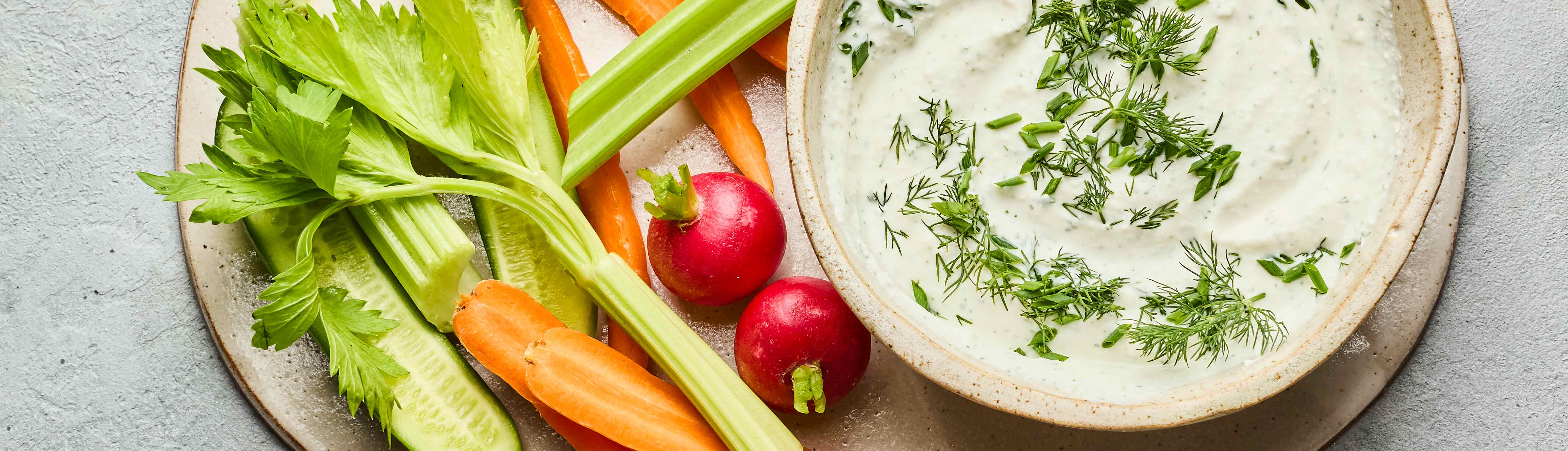 Cottage cheese makes a great creamy base for herbs and spices, like in our whipped cottage cheese ranch dip, where it’s paired with garlic, dill, parsley and lemon. We like to eat this dip with some crunchy veg like sliced carrot, cucumber or peppers.