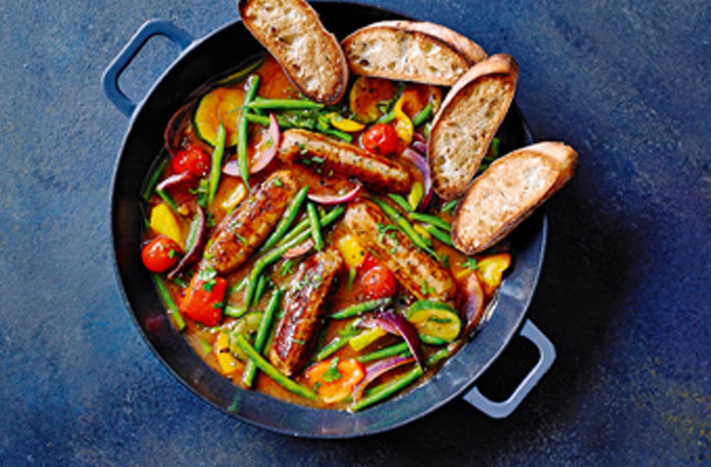 You can't beat a sausage traybake for tea and this recipe is topped with greens and served with potato wedges for a hearty meal. We've used tasty reduced-fat sausages, teamed with smoked paprika and baked beans for smoky-sweet flavours. It's a family meal you'll be making on repeat!