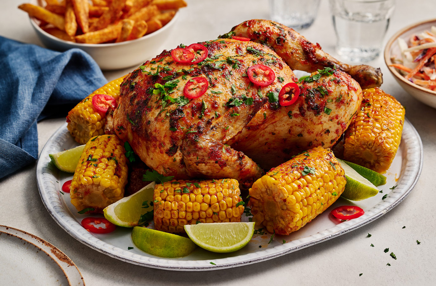 Cooking your chicken in a slow-cooker is an easy, hands-off method that guarantees a juicy result. We've rubbed a piri piri-inspired spice blend on the chicken before cooking alongside corn on the cob. Serve with chips and slaw for a delicious feast.