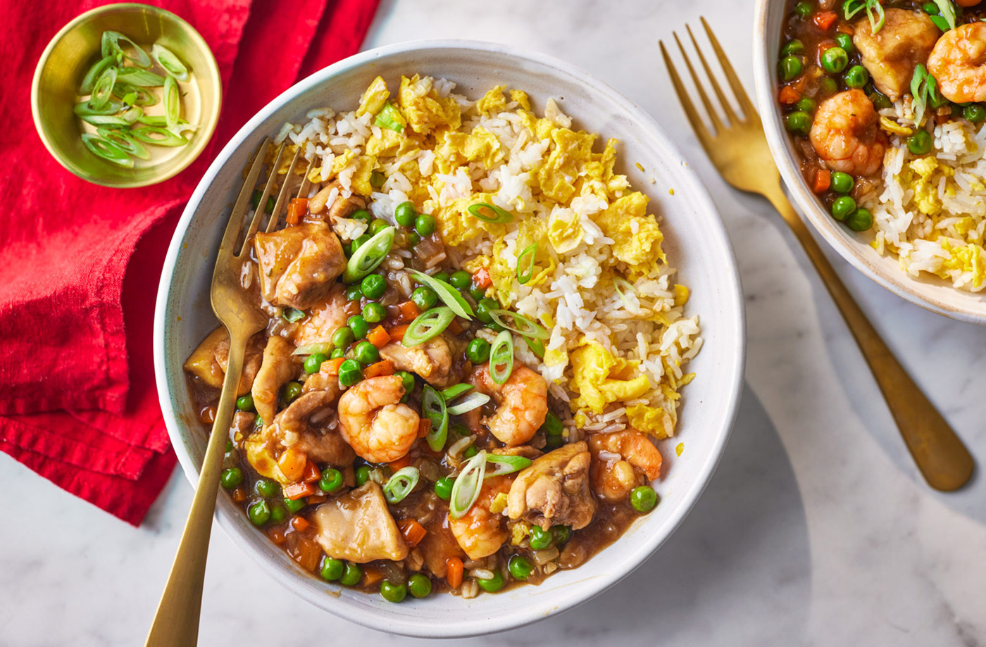 Try Verna Gao's hokkien-style fried rice for the ultimate fakeaway! Egg fried rice is topped with a protein and veg-rich gravy, flavoured with soy and oyster sauce. This Chinese-inspired recipe is perfect for your Lunar New Year celebrations.