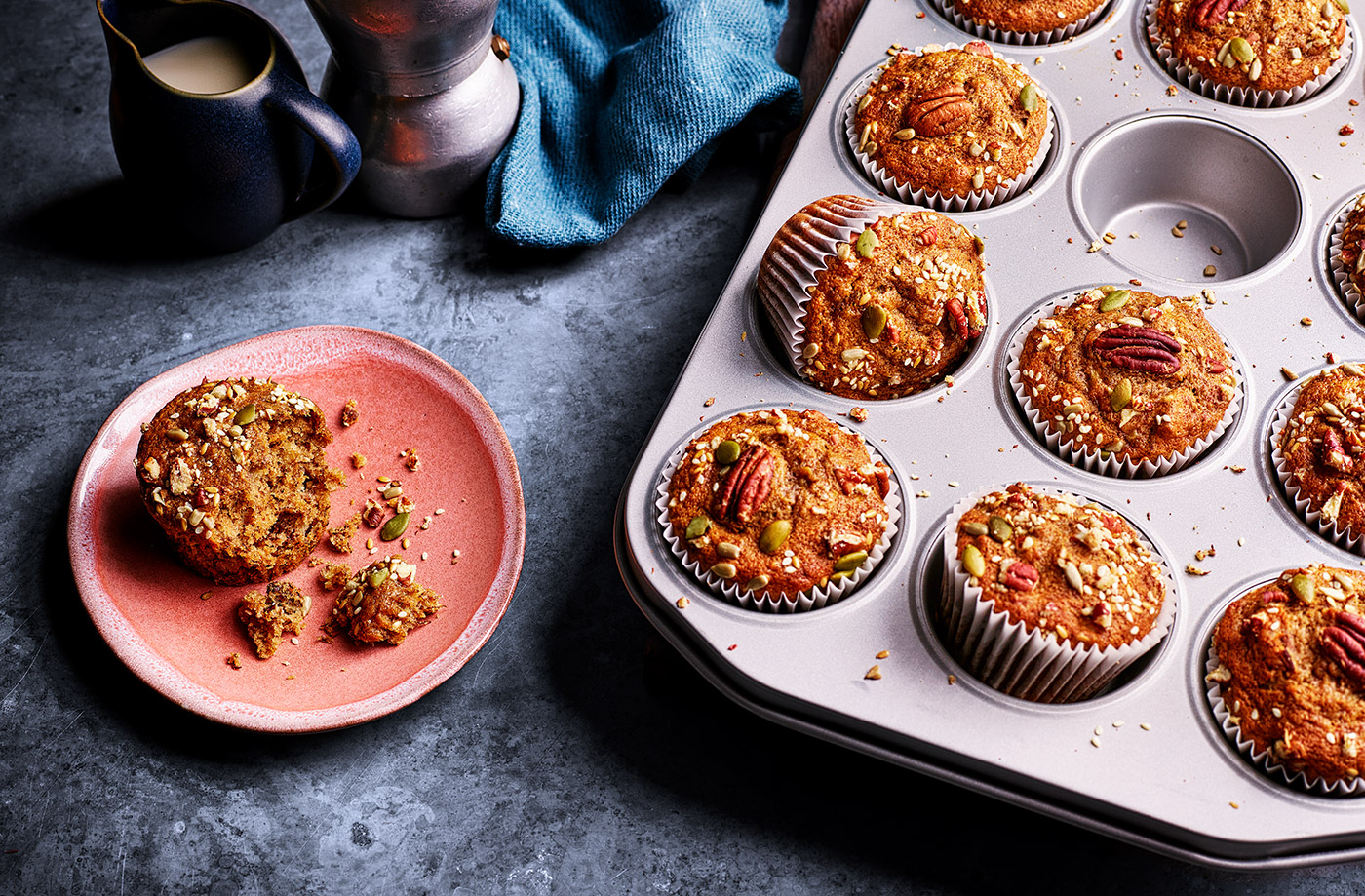 The ultimate grab-and-go breakfast - bake a batch of these banana muffins to store in the fridge (for up to a week) or freeze. Adding maple syrup, pecans and mixed seeds really takes these breakfast muffins to the next level!