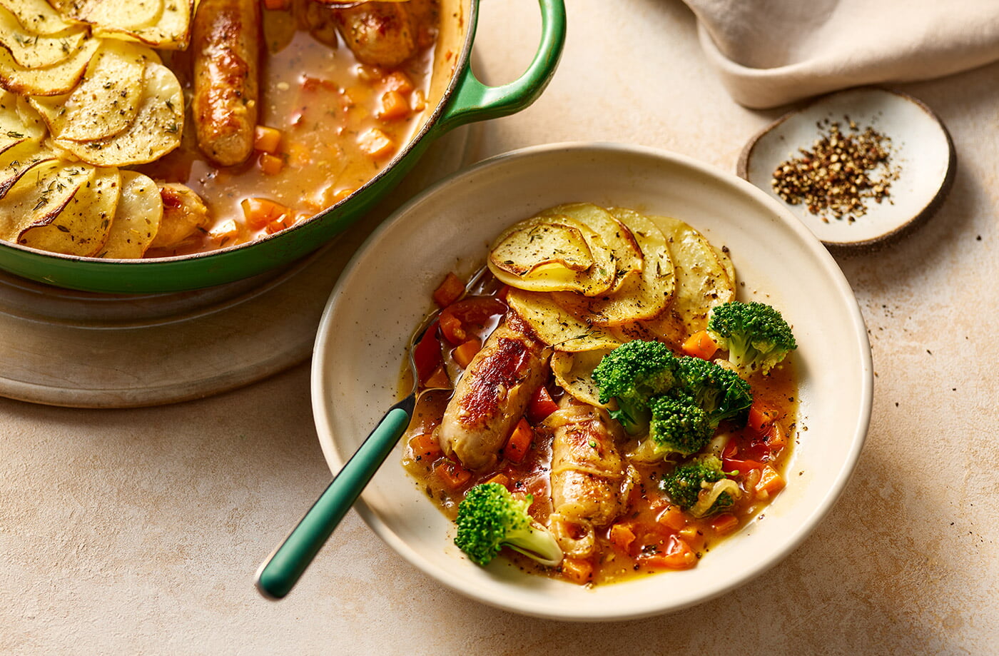 This family-friendly sausage casserole is served with tender caramelised onions and crispy potatoes for an delicious twist on a comforting classic. Try using veggie sausages, if you like.