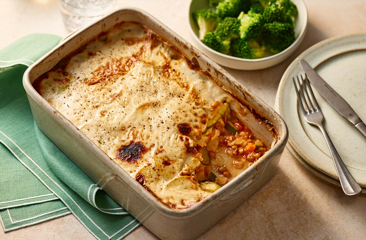 Craving something comforting and healthy? This veggie moussaka recipe is what you need! We've given the classic bake a fresh, 'green' twist with courgette slices and fibre-rich lentils, which pack in 3 of your 5-a-day. Layer it up with tender potatoes and jarred white sauce (for quickness), then bake until golden and bubbling. Serve with steamed broccoli or a crisp leafy salad, if you like.