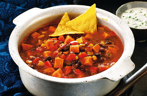 All the familiar flavours of a chilli con carne without the meat, this spicy bean and sweet potato stew is a straightforward and filling crowd-pleaser with black eyed beans, kidney beans, and sweetcorn. Simply leave out the crème fraiche finish for a vegan edition.