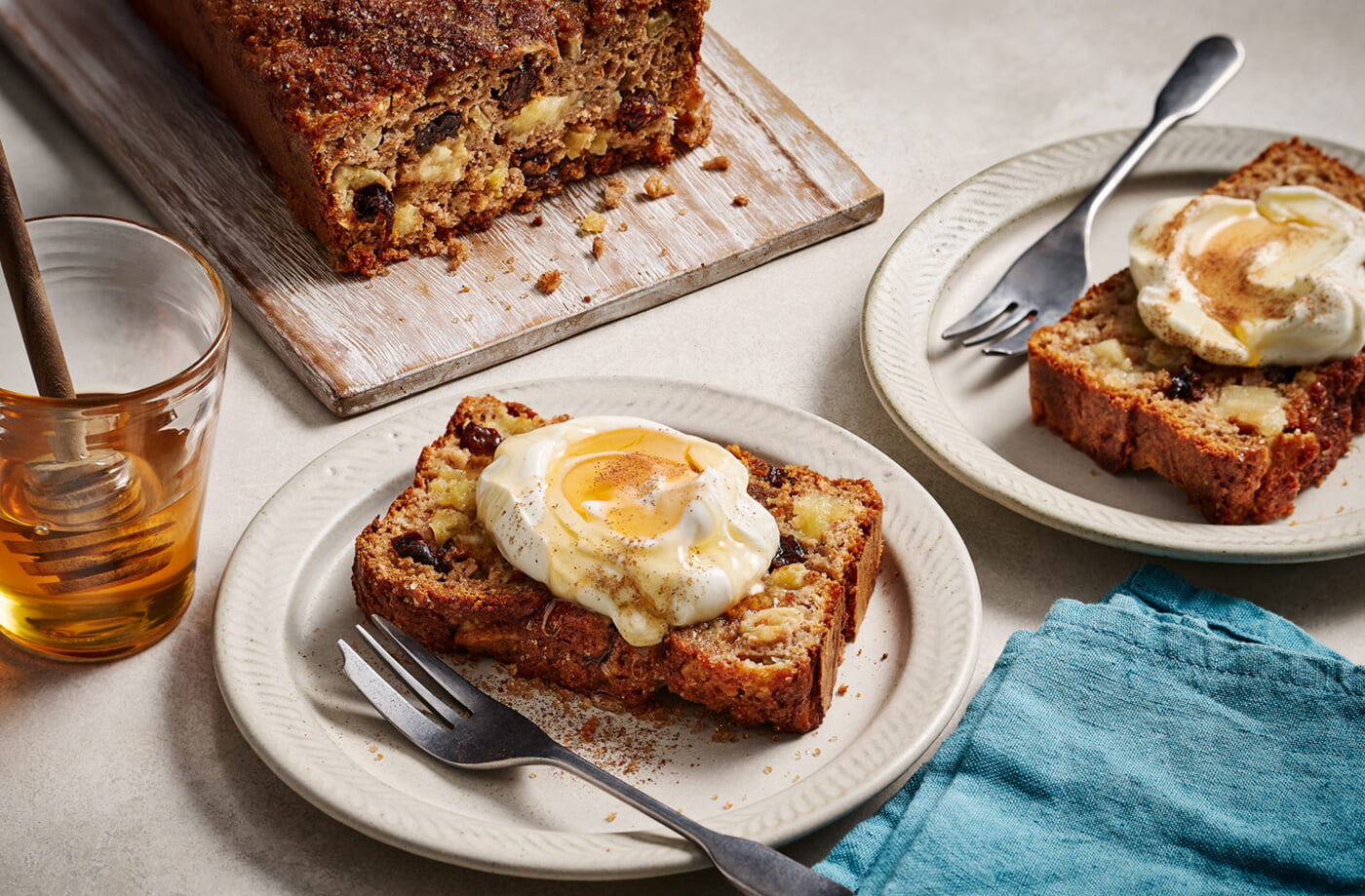 Turn your morning oats into a fun apple pie-inspired breakfast bake. This loaf is sweetened with apple sauce which also adds a little tartness. Mix with raisins, cinnamon and a little brown sugar for a delicious breakfast that's bursting with autumnal flavours.