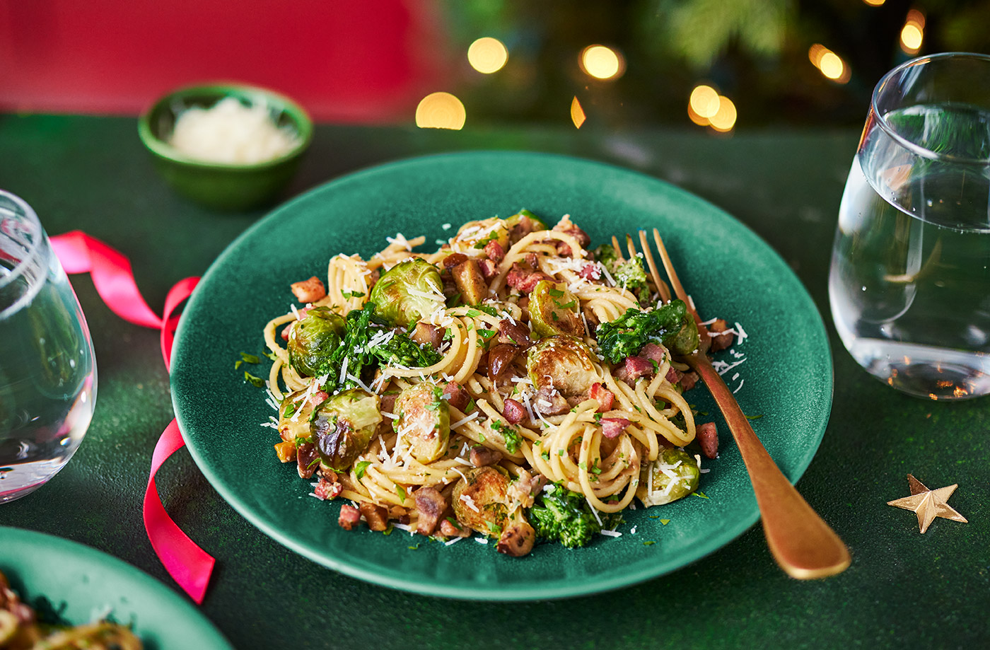 Crispy caramelised sprouts add a sweet crunch and festive twist to this carbonara.